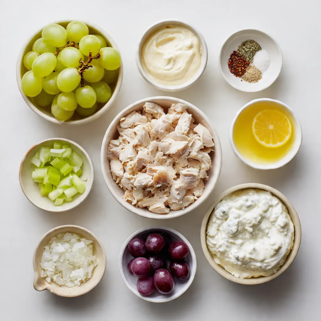 Start by making sure everything is cool and dry. Dice or shred the chicken into bite-sized pieces. Halve the grapes so they’re juicy but easy to eat. Chop the celery and onion finely so they blend smoothly without overpowering the bowl.