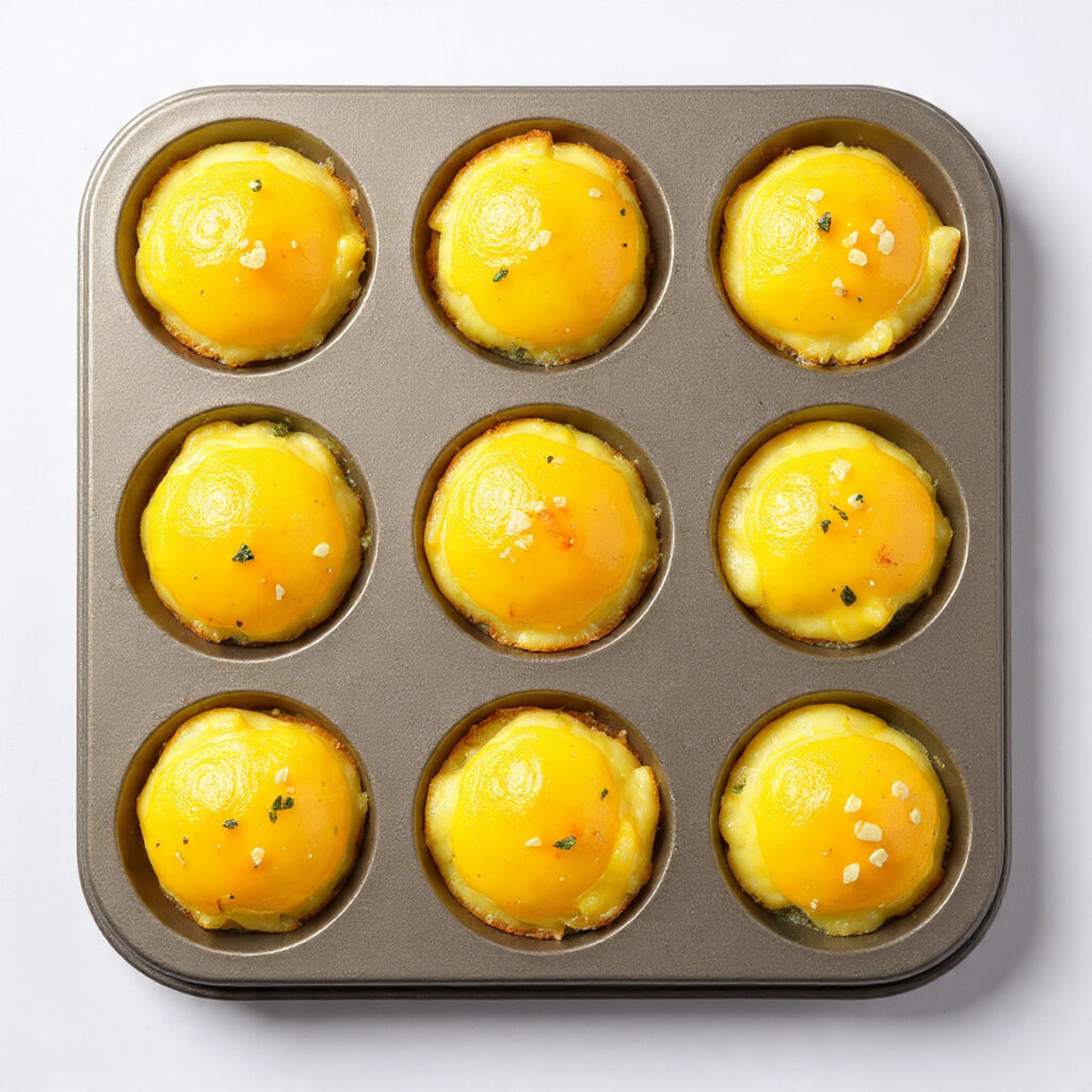 Pour the mixture into the prepared muffin pan and bake until the tops look set and lightly puffed. Let them rest briefly before removing, so they firm up and release cleanly.