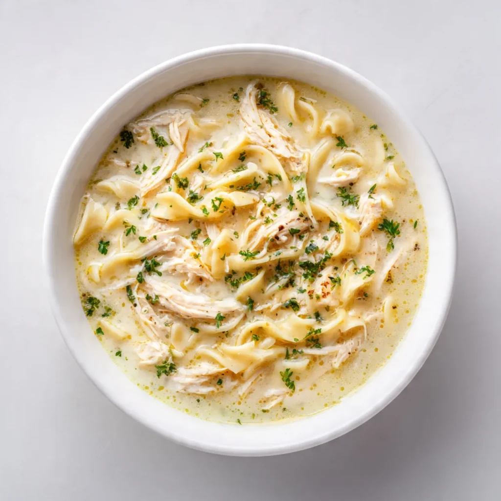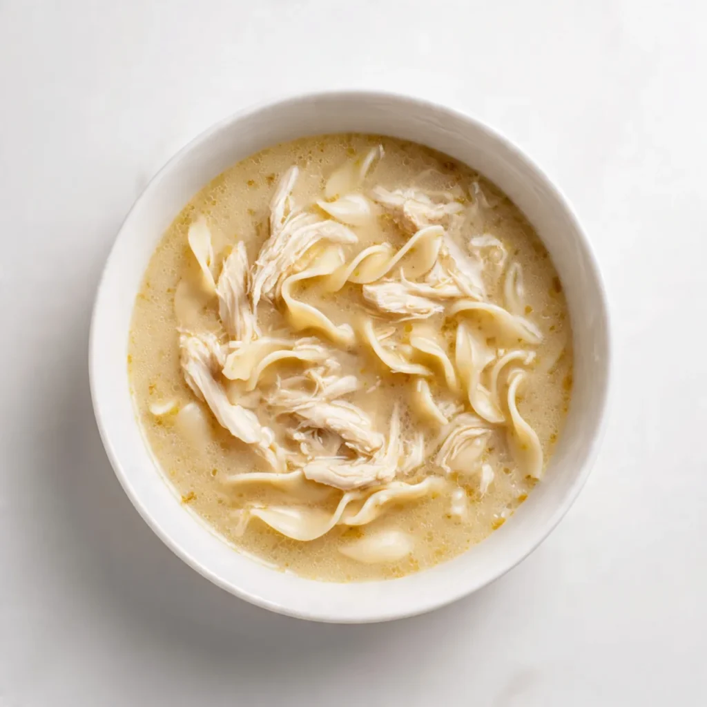 A warm, comforting soup with tender chicken, soft noodles, and a gently creamy broth. Easy to make, filling, and perfect for cozy family meals.