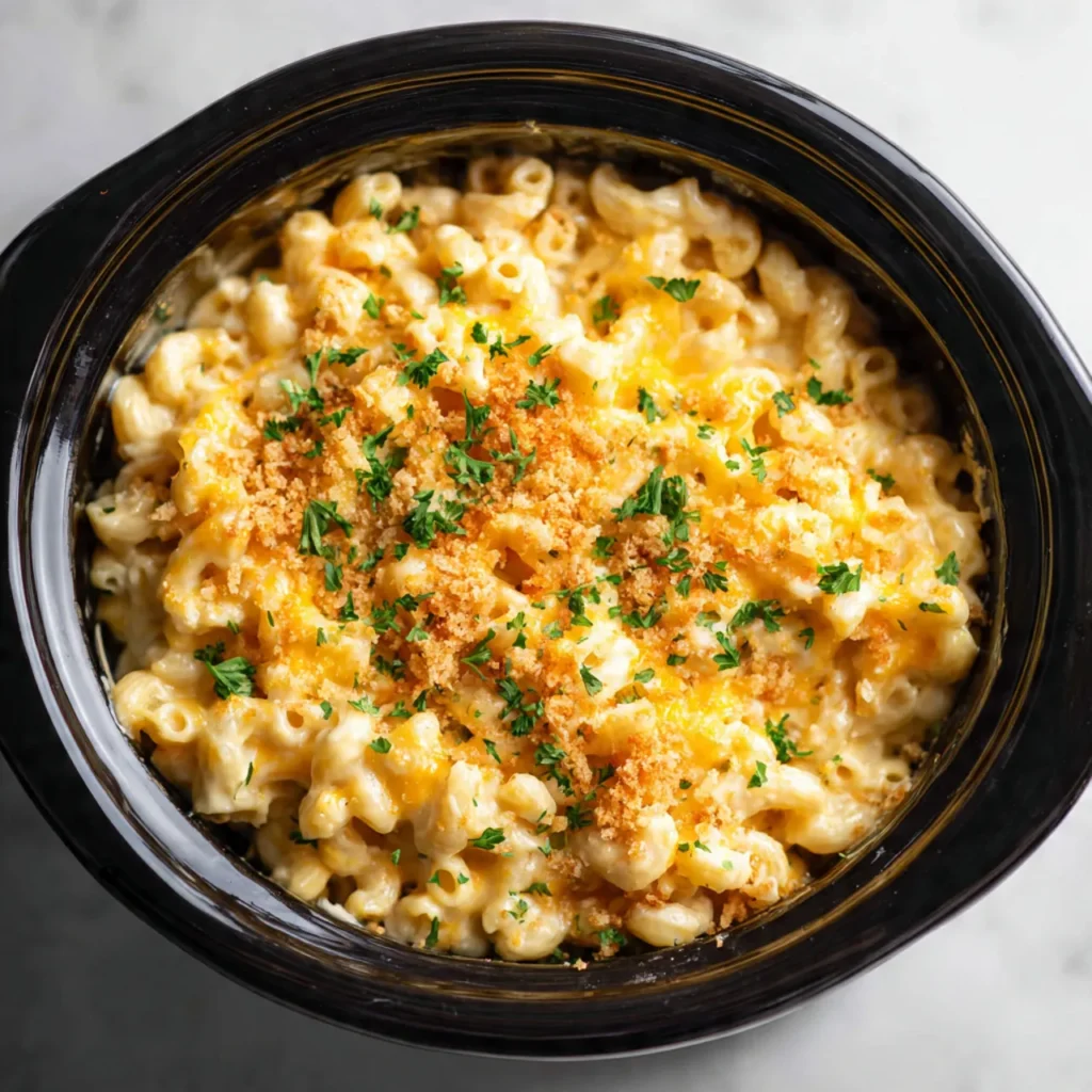 Cover and cook on low for 2–3 hours, stirring halfway through. Check pasta for tenderness and stir again, letting the cheese begin to melt evenly into the sauce.