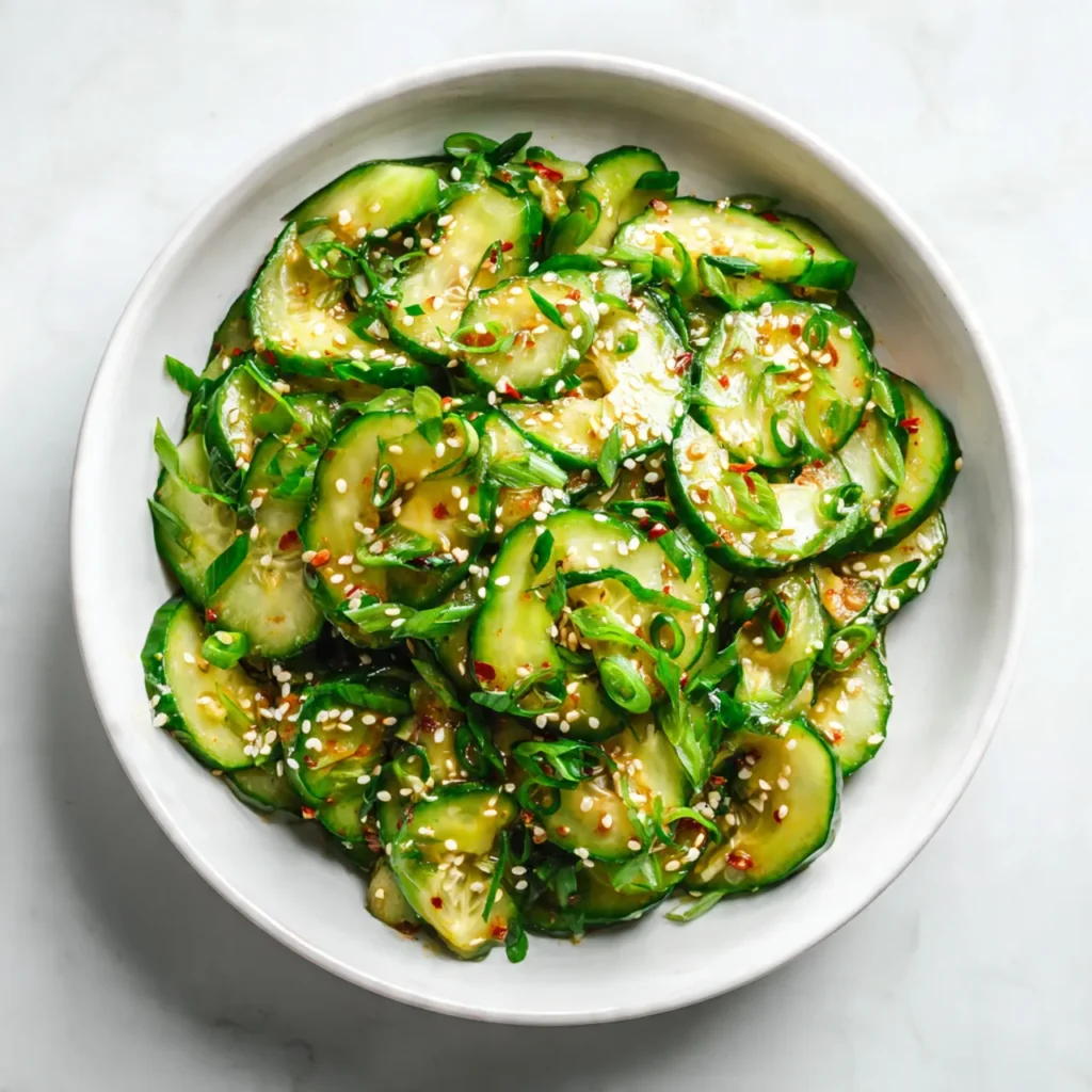 - Add cucumbers to a large bowl, pour dressing over, toss gently, and sprinkle green onions and sesame seeds.