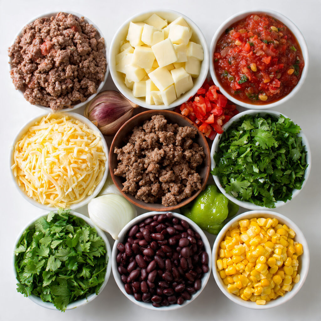 - Cook Beef: In a skillet, cook ground beef with onions and garlic until browned. Drain excess fat.