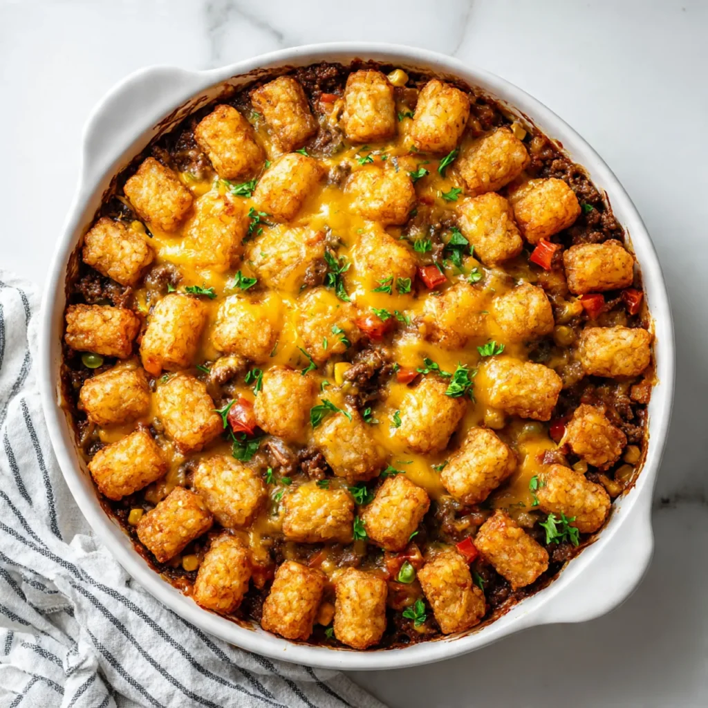 Top with tater tots and remaining cheddar. Bake uncovered 30–35 minutes until tots are golden and cheese is bubbly.