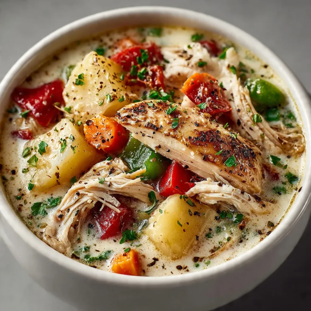 Add small pieces of cooked turkey or leftover roast chicken along with the shredded chicken. Keep portions modest so the soup stays creamy instead of crowded, and let the flavors blend gently.