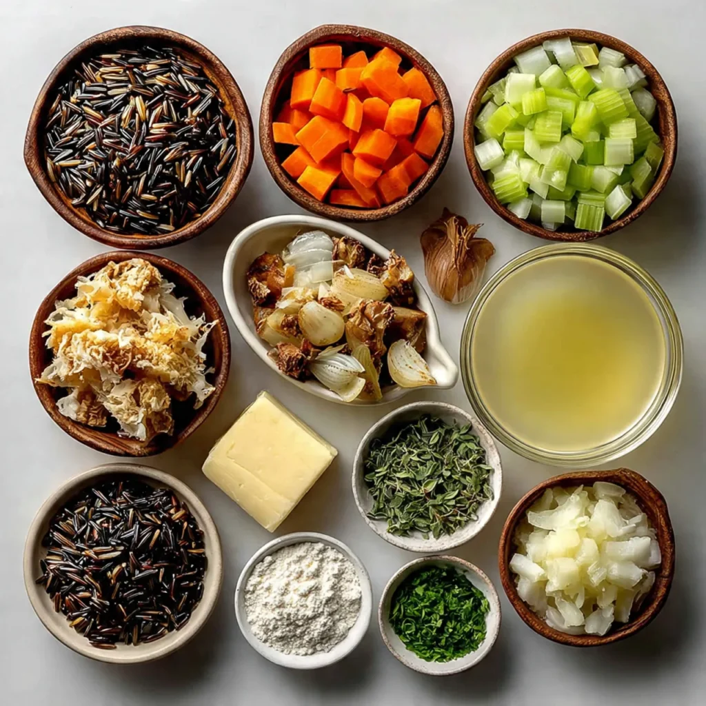 Dice the onion, slice the carrots and celery, and mince the garlic. Cut the chicken into bite-size pieces. Rinse the wild rice well so it cooks evenly and is ready to add later.