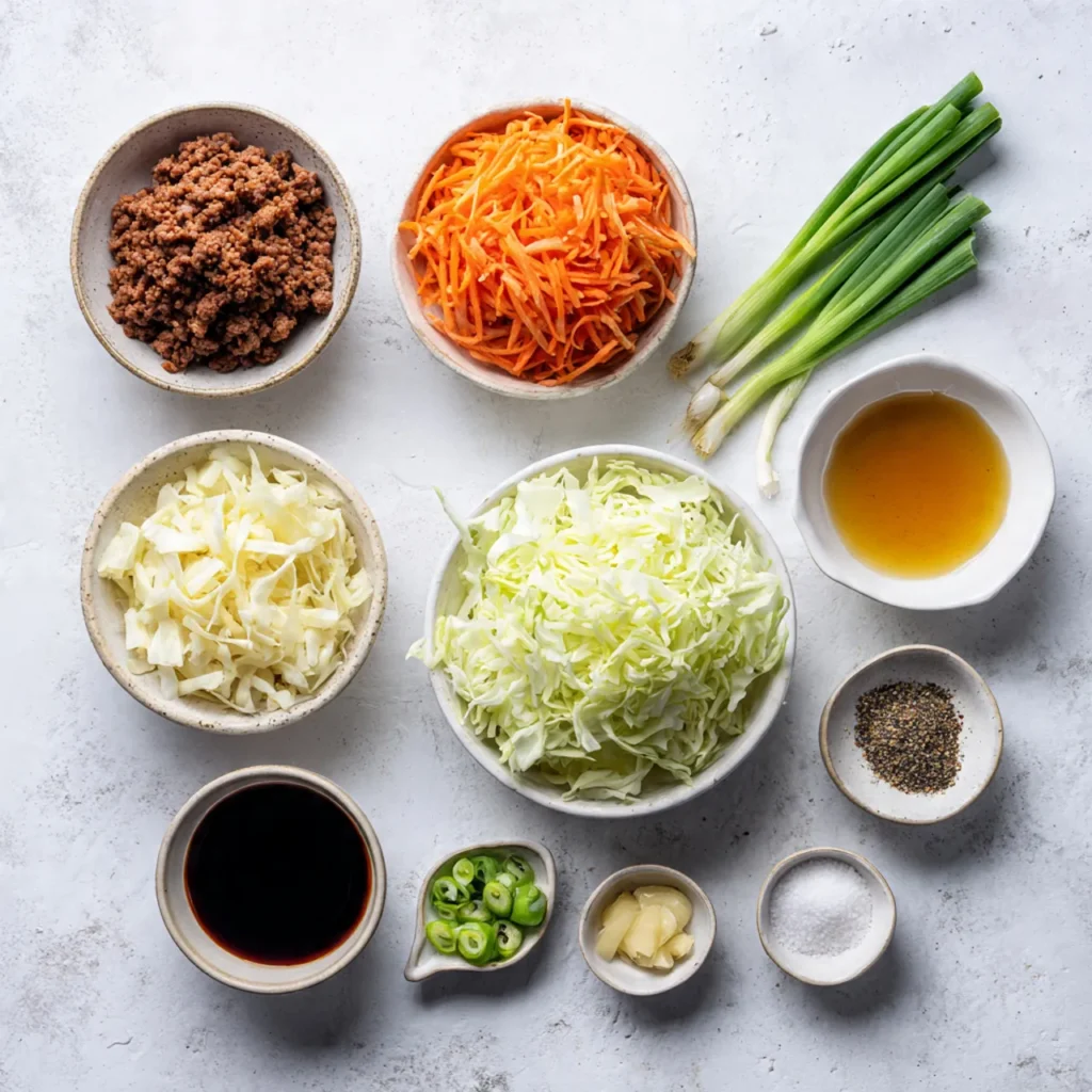 Chop the cabbage into thin strips and shred the carrots until soft and feathery. Dice the onion small so it cooks evenly. Measure sauces and spices ahead of time, letting everything sit ready near the stove for a smooth cooking flow.